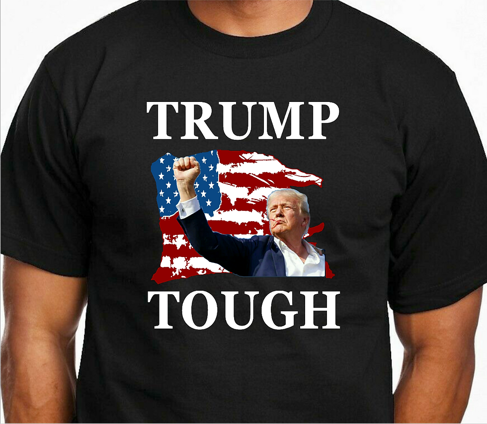 TRUMP TOUGH RAISED ARM FIST BLOODY FACE AMERICAN FLAG TSHIRT